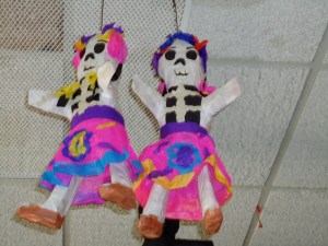 This little shop is filled with mostly Mexican folk art but I did see some African and Asian pieces as well. What I did learn from this workshop was what the certain elements of a Dia de los Muertos altar meant and what you should include to honor your loved one. When you make an altar, you are to include food (plastic or pictures), liquor (little fake bottles), dried marigold leaves, incense, a picture of your loved one, candles and a tiny vial of water. There are meanings for the color of candle you use, the food you include, why you use incense etc…Additional elements include sugar skulls (calveras), skeletons and fun elements like sparkles and glitter.